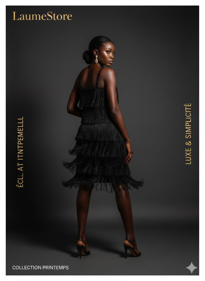 La robe ÉCLAT Intemporelle incarne une élégance audacieuse et raffinée. Confectionnée dans un tissu noir profond rehaussé de franges délicates, elle crée un effet de mouvement subtil et captivant à chaque pas.